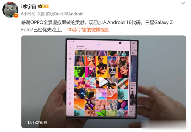 据博主 @i冰宇宙 分享,OPPO 全景虚拟屏现已加入 Android 16 代码,三星 Galaxy Z Fold7 已经优先支持该功能。
